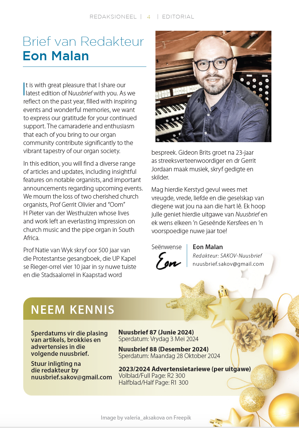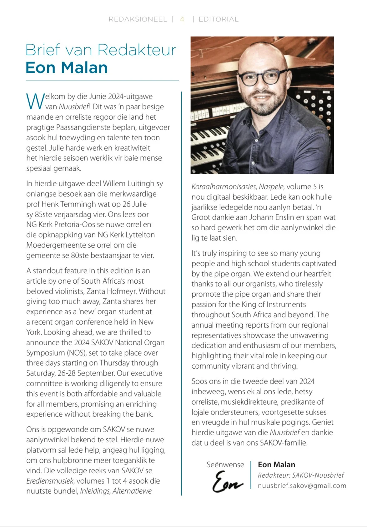 Eon Malan 10/09/2025 Eon Malan 10/09/2025 If our hearts are full, our singing will be full. Read More Eon Malan 04/09/2025 Eon Malan 04/09/2025 Thank you SAKOV! Read More Eon Malan 17/12/2024 Eon Malan 17/12/2024 SAKOV Nuusbrief | Newsletter #88 Read More Eon Malan 29/06/2024 Eon Malan 29/06/2024 SAKOV Nuusbrief | Newsletter #87 Read More Eon Malan 25/12/2023 Eon Malan 25/12/2023 Quail & Selwyn Rings for Christmas Read More Eon Malan 16/12/2023 Eon Malan 16/12/2023 SAKOV Nuusbrief | Newsletter #86 Read More Eon Malan 21/09/2023 Eon Malan 21/09/2023 Welcome Back! Read More Eon Malan 22/07/2023 Eon Malan 22/07/2023 SAKOV Nuusbrief | Newsletter #85 Read More Eon Malan 10/07/2023 Eon Malan 10/07/2023 Making a Joyful Noise at Sharon Road Presbyterian Church Read More Eon Malan 22/10/2022 Eon Malan 22/10/2022 ROCKINGHAM Read More Eon Malan 01/08/2022 Eon Malan 01/08/2022 Appointed as new Editor of SAKOV Nuusbrief Read More Eon Malan 11/06/2022 Eon Malan 11/06/2022 A farewell to the short-lived Cambridge Handbell Choir A farewell to the short-lived Cambridge Handbell Choir. Read More Eon Malan 04/04/2022 Eon Malan 04/04/2022 Success! Hymn Playing Workshop Read More Eon Malan 28/01/2022 Eon Malan 28/01/2022 Two organ meditations for Russ & Amy Dean Read More Eon Malan 16/12/2021 Eon Malan 16/12/2021 Joy to the World! Joy to the World Read More Eon Malan 25/09/2021 Eon Malan 25/09/2021 Bursary Awarded - SAKOV 2021 Read More Eon Malan 01/07/2021 Eon Malan 01/07/2021 Waikato’s first Organ Week to be hosted in Cambridge Read More Eon Malan 01/07/2021 Eon Malan 01/07/2021 Hamilton Organ Concert with Paul Rosoman Read More Eon Malan 01/07/2021 Eon Malan 01/07/2021 Organ Week in Cambridge Read More Eon Malan 10/06/2021 Eon Malan 10/06/2021 Annual Mosaic Modern Choir Concert 2021 Read More Older Posts