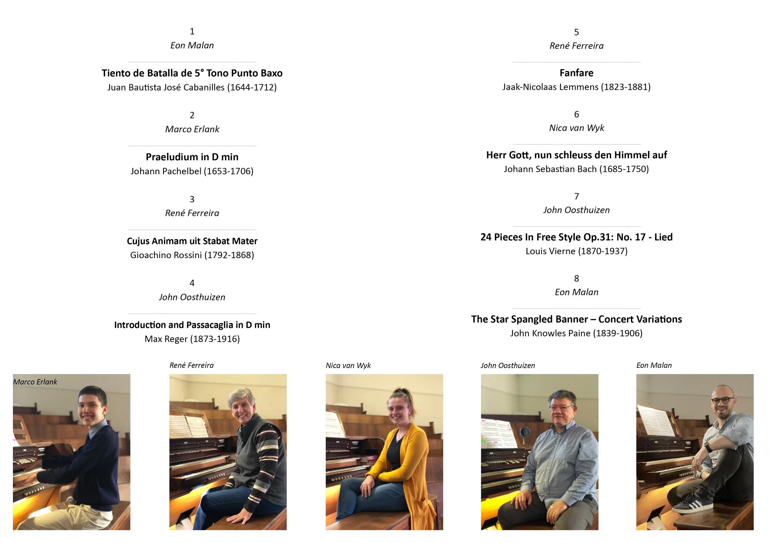 Marco Erlank skryf: Marco het in 2007 op 5-jarige ouderdom met klavierlesse by Mev. Jeanne Maritz in Curro Durbanville begin waar hy steeds lesneem. Hy speel volgende maand sy Graad 8 finale eksamen. Op 11-jarige ouderdom het hy ook by Mev. Maritz met orrel as tweede instrument begin. Hy was onmiddelik baie entoesiasties oor die instrument en het op aanbeveling van haar die daaropvolgende jaar by Mev. Marian Steyl met lesse voortgegaan. Marco het van 2015 tot 2018 elke jaar aan die Tygerberg Eisteddfod en die Stellenbosch Kunswedstryd deelgeneem. Hy is twee keer by die Stellenbosch Kunswedstryd aangewys as die beste presteerder, en wen vier agtereenvolgende jare (2015 tot 2018) die orrelkategorie van die Tygerberg Eisteddfod. In 2016, 2017 en 2018 ontvang hy ’n SAKOV-beurs vir skoliere (Hy koop vir hom ’n oefenorrel met die eerste beurs), en hy tree ook op by die Wes-Kaap se streekbyeenkoms in Augustus 2016. Teen die einde van 2016 het Johan van Lill van Radio RSG ’n onderhoud met Marco uitgesaai waarin hy uitgebrei het oor sy opgewondenheid oor die orrel, en ook van sy werke voorgespeel het. Hy tree ook soms in sy eie gemeente op. Die groot eer wat hom verlede jaar te beurt geval het om op SAKOV se Beurswennerkonsert in Pretoria te kon speel, tel onder Marco se groot musiekhoogtepunte. Gedurende die onlangse skoolvakansie was Marco in Switserland waar hy die geleentheid gehad het om op die Würzbrunnenkirche in Emmental te kon optree. Die kerk is ongeveer 'n duisend jaar oud.
