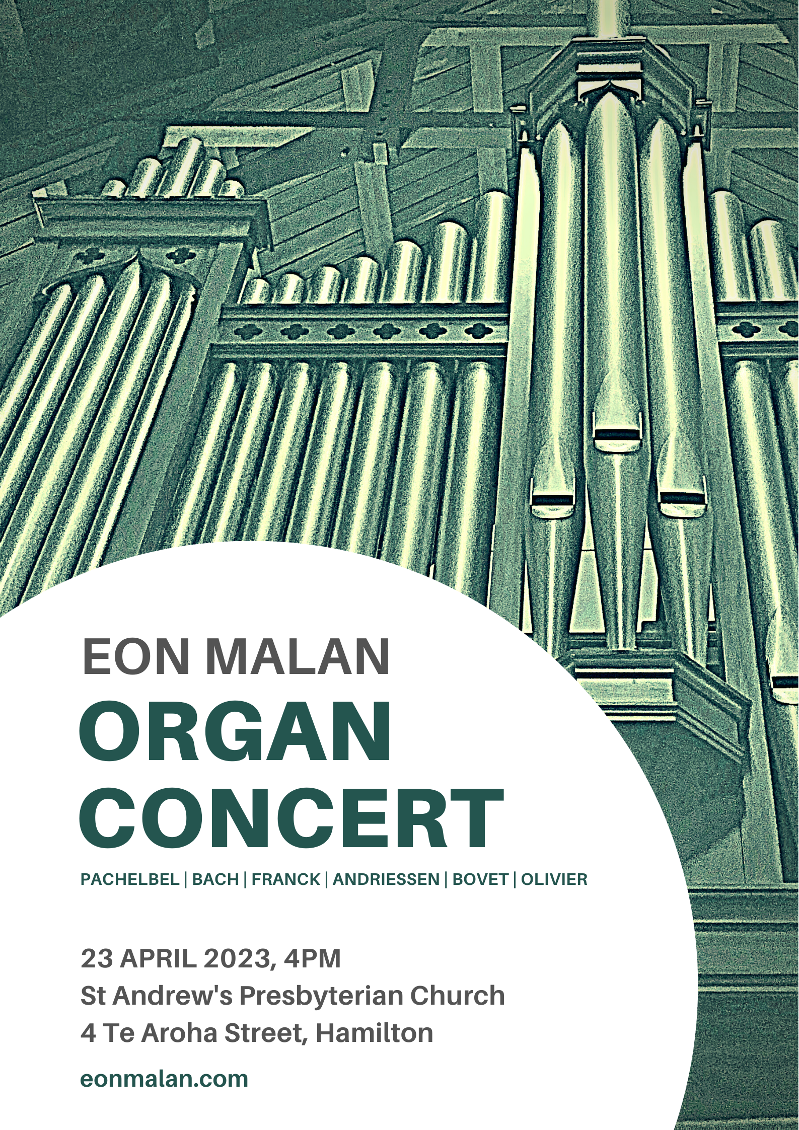 This will be Eon’s last concert at St Andrew’s Anglican church Cambridge. He will be playing favourite organ music from Pacehlbel, Van Hoef, Behnke, Bovet and Bach.